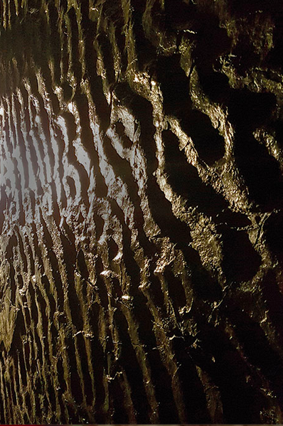 Etwa in der Mitte des Berges, unter dem sich die Stollen befinden, zeigt die seitliche senkrechte Stollenwand eine wellige Oberfläche.